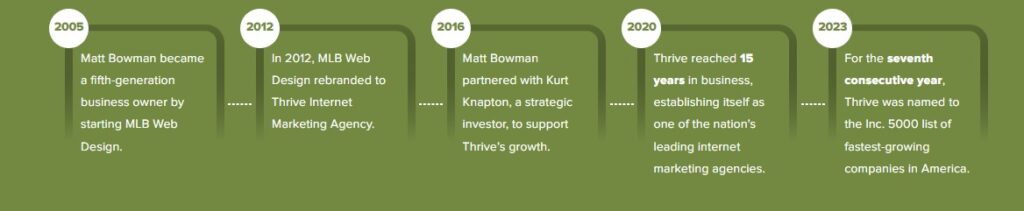 In 2005, Bowman ventured into digital marketing and established MLB Web Design (now called Thrive). The team started expanding as the company grew in its early years and in 2012, MLB Web Design was renamed Thrive Internet Marketing Agency.