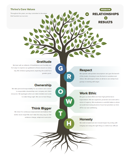 Thrive’s success is deeply rooted in its culture and values. We maintain a strong company culture built on our core values to ensure our clients and employees are satisfied with their growth.